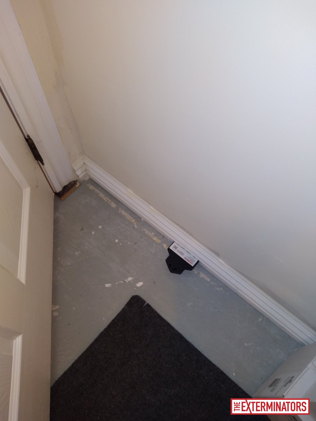 Interior inspections identified areas of rodent movement along basement walls, utility penetrations, and near kitchen baseboards. No obvious exterior entry points were confirmed during inspections, suggesting mice were already established within wall voids or interior spaces.