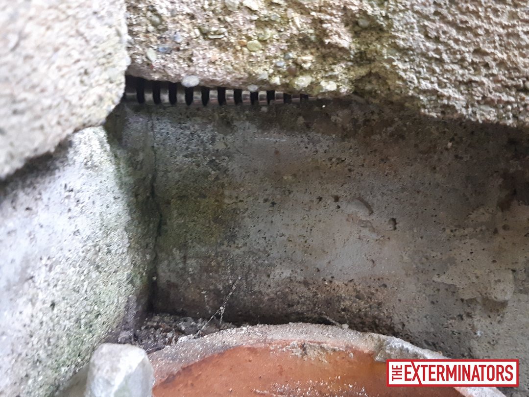 As part of the approved scope, ten foundation weep vents were sealed using stainless steel vented inserts designed to maintain airflow while preventing rodent entry. One wall vent was protected with a galvanized steel vent cover. A proposed treatment for the rear deck area and additional roof vent sealing were assessed but not approved and therefore not completed during this visit.